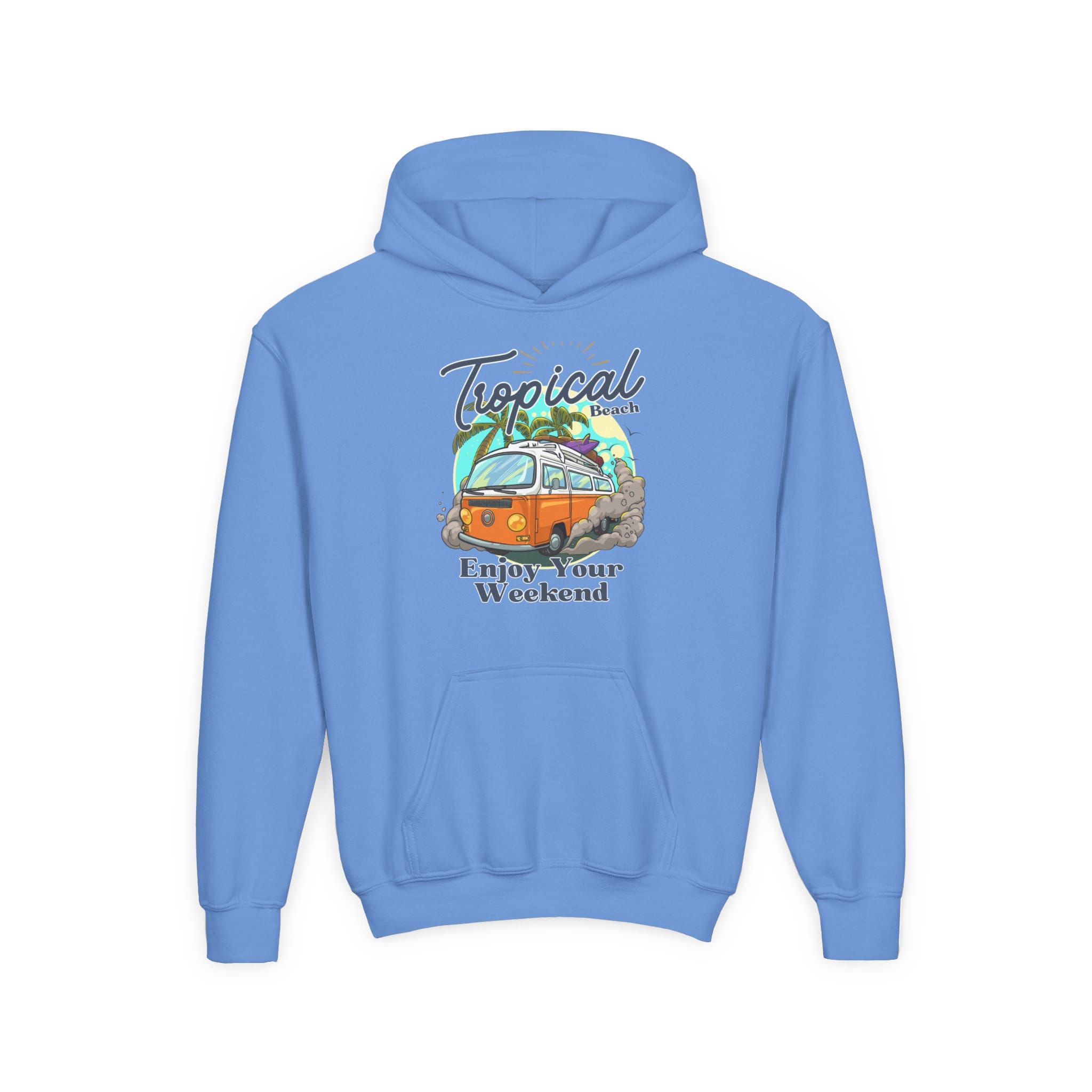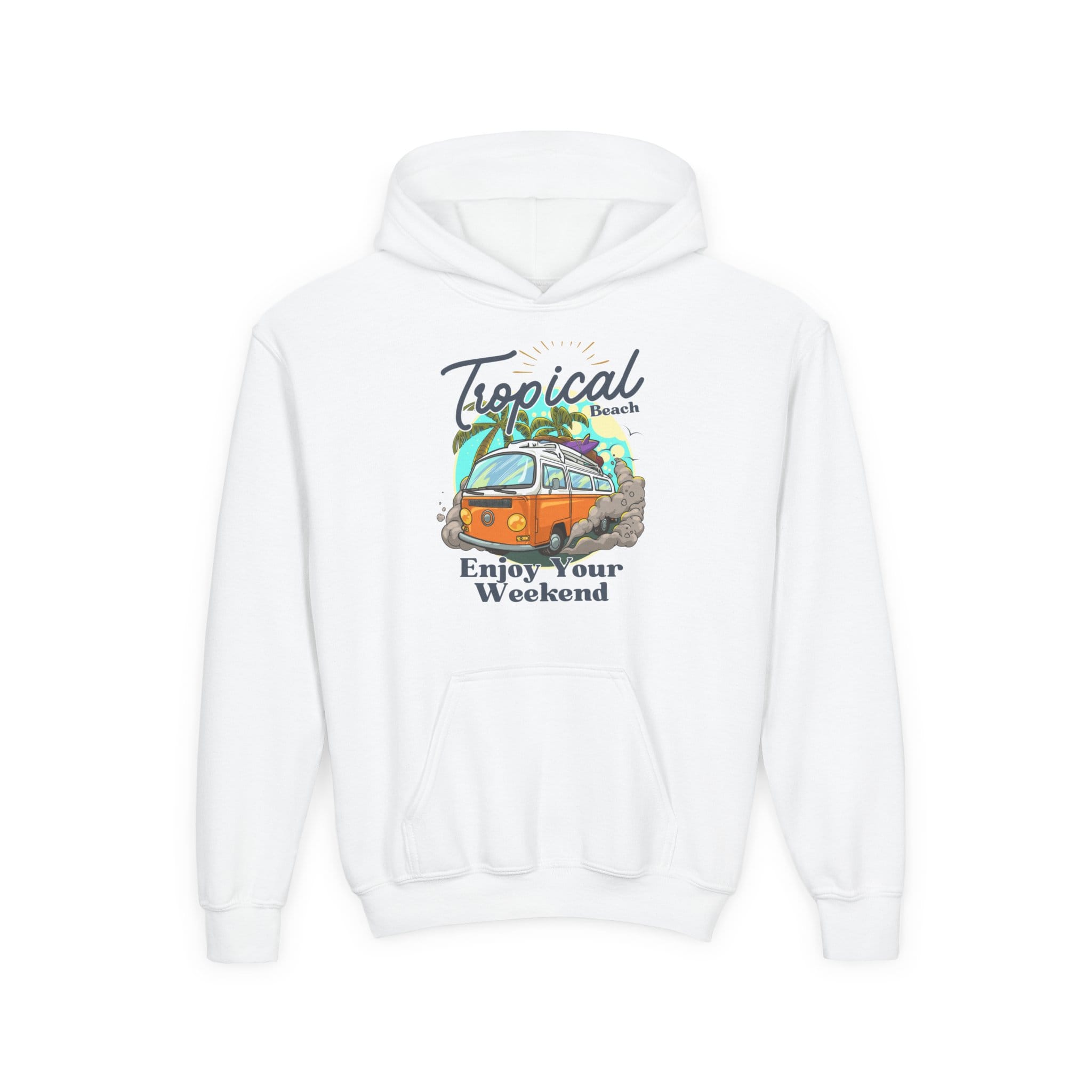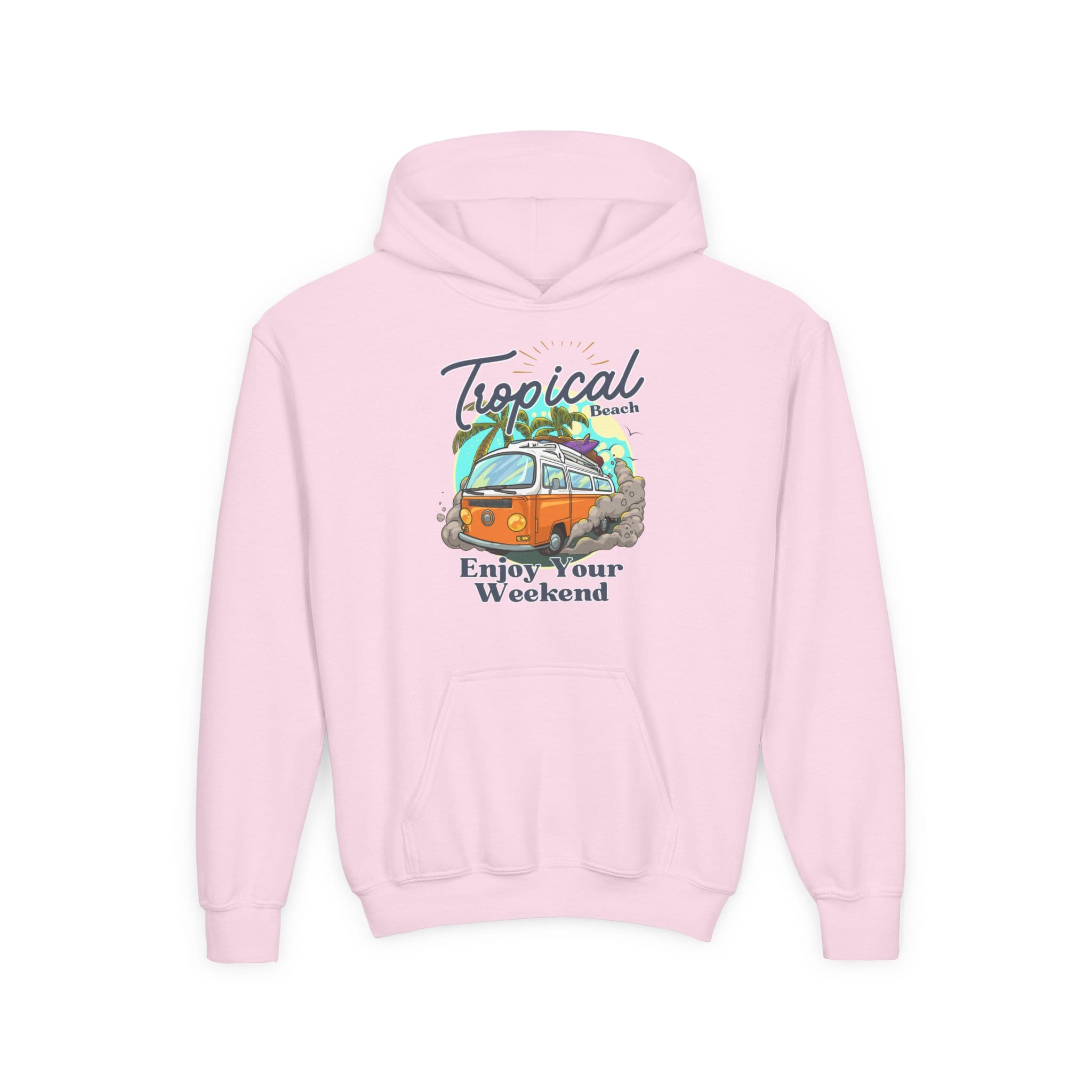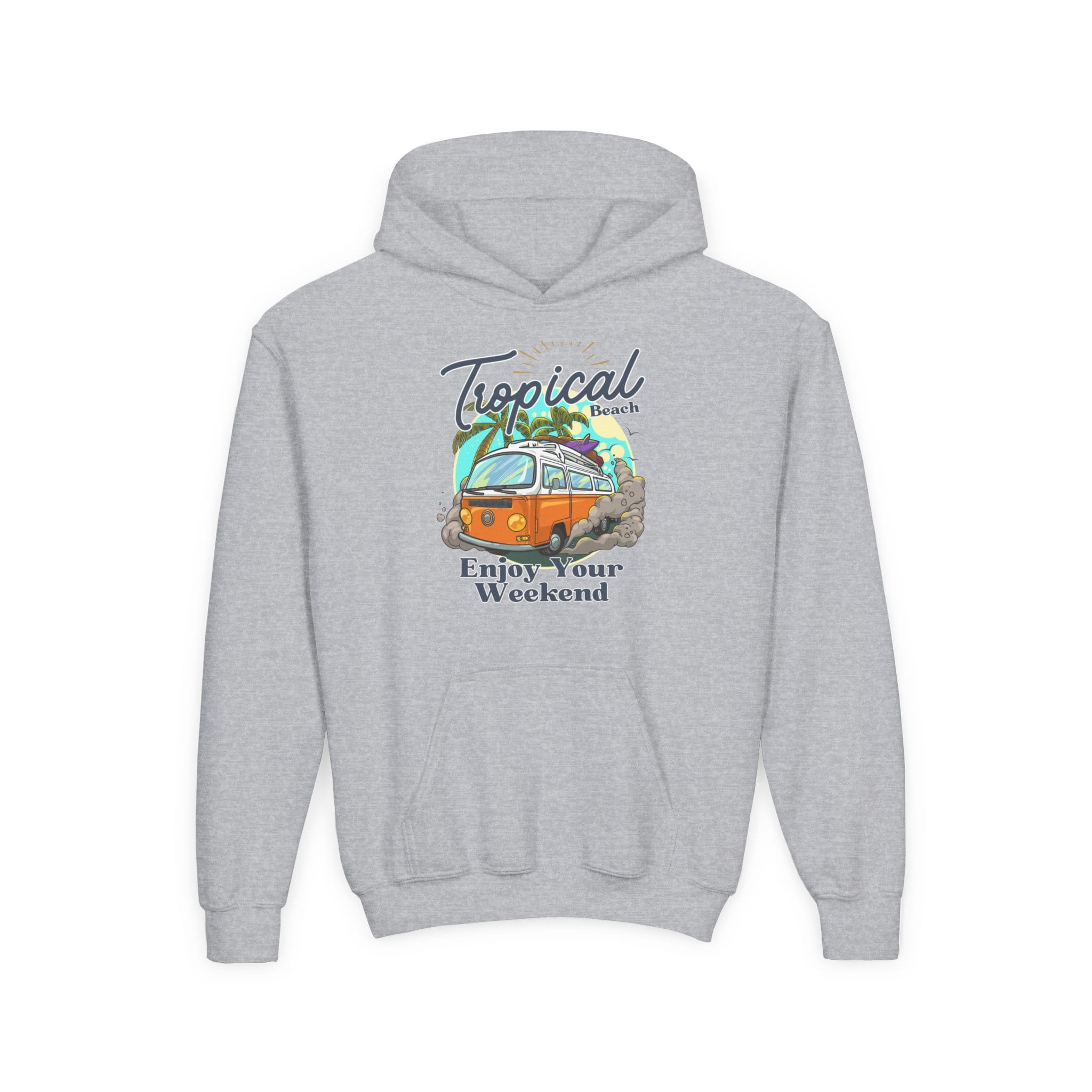 Tropical Weekend Hoodie, Youth Pullover Sweatshirt, Beach Style, Gift for Kids, Summer Vibes, Travel Apparel